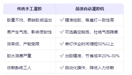 灌膠正是解決這些問題的核心手段——通過將特種膠水注入燈體內(nèi)部,對電子元器件進(jìn)行全面包裹與填充,實現(xiàn):